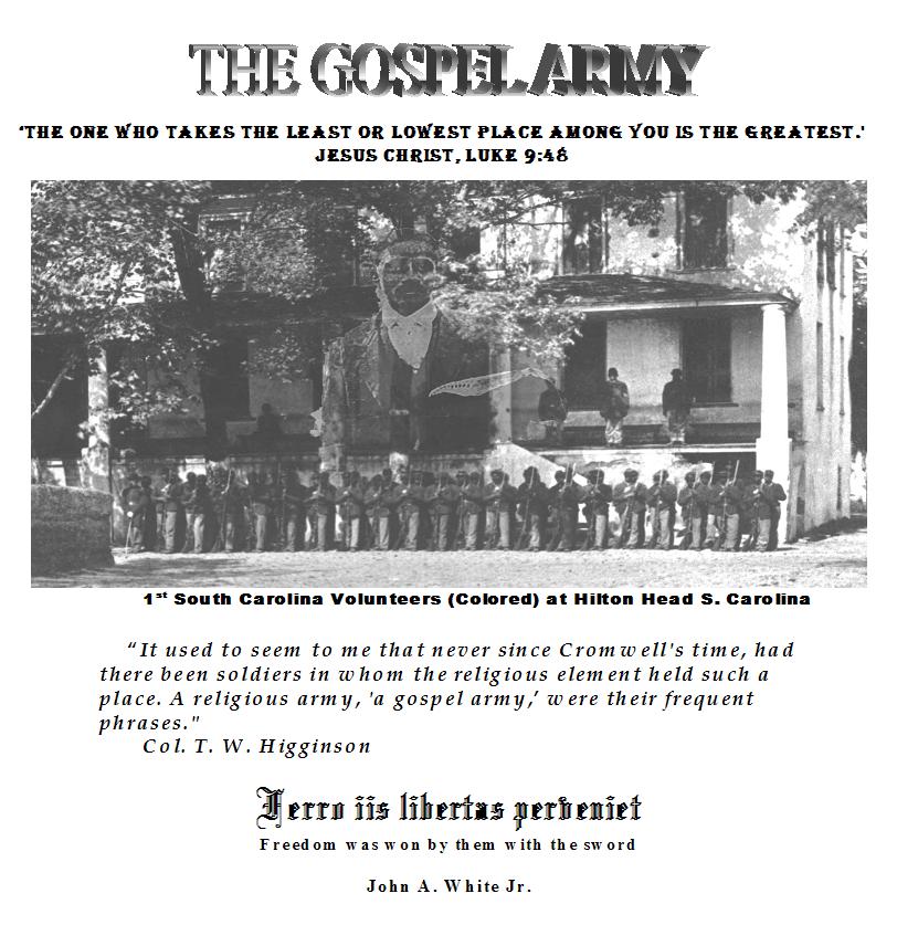 The 1st South Carolina Volunteers was the first black regiment to be formed during the Civil War. They felt that this was the time chosen by God for their deliverance from slavery and they called themselves "The Gospel Army." MISSION The mission of the Gospel Army Black History Group is to use Civil War era African-American history to teach basic teachings of Jesus Christ. Where there was hopelessness, Christ provide hope. Black history of this era however was distorted and hidden for financial gain. We are committed to assuring that the truth be told and recorded. This history relies on primary historical records rather than historian interpretations. OUR MOTTO When we treat others inhumanely, we destroy our own humanity and when we give hope to others, we serve God. BACKGROUND