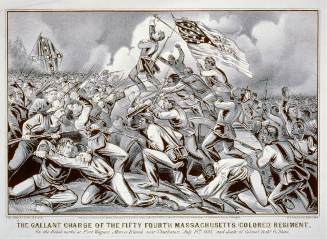 Storming Fort Wagner by Louis Kurz & Alexander Allison 1893 Glory (1989 Movie) - "We're ready Colonel." On July 18, 1863 the 54th Massachusetts attacked Fort Wagner (depicted in the movie "Glory" and W. H. Carney was awarded a Congressional Medal of Honor many years later. A Flag belonging to the 54th Massachusetts was the first Christian flag to enter the Civil War.