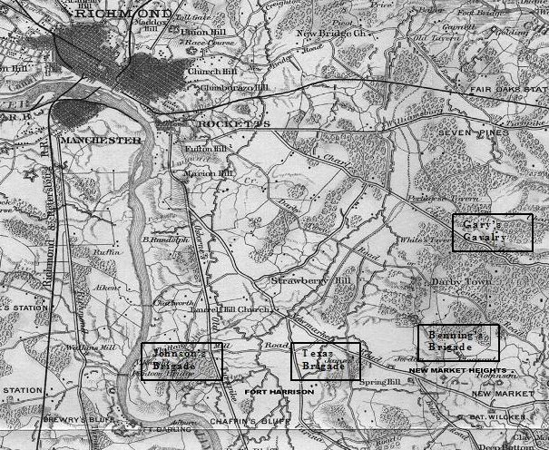 Park Service Map, Note that Benning's Brigade is not included. Wade Hamptons Legion and the City Brigade were also not included but were deployed near New Market Heights as well.