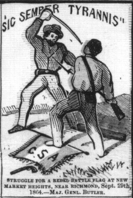 Brevet Major General Alfred H. Terry lined up his entire division of White troops in battle line, which included Abbott’s Second Brigade, Pond’s First Brigade and Plaisted’s Third Brigade. Brig. General Charles Paine’s Third Division of Colored Troops would attack New Market Heights on the left flank of Terry’s Second Brigade under Col. Abbott. First he sent in The Third Brigade under Colonel Samuel A. Duncan, which consisted of 4th USCT, 6th USCT and the 2nd USCT Cavalry. These men were sent in as skirmishers to reveal the strength of the confederate line and told to capture the heights if possible. At the same time, General Terry deployed the Seventh Connecticut Volunteers as skirmishers for Abbott’s Second Brigade Out of 12 flag bearers all were killed or wounded but one. One of the flag barriers was Alfred Hilton who carried two flags one belonging to a dead flag bearer and the other belonging to himself. As men were being shot he struggled to keep the flags from touching the ground until he was shot in the leg. He said “Boys, save the colors”. Private Charles Veal grabbed the regimental flag and Sergeant Fleetwood Grabbed the American flag and they continued their climb of New Market Heights. Out numbered with many dead and wounded they retreated back to their line, which was still entangled in the abatis. Fleetwood rallied the survivors around his flag for another attach. Some men made it to the top and as Butler requested they said, “remember Fort Pillow”, however completely out numbered, they were killed or captured then murdered. Casualties were heavy, some where between 400 to 500 men. Colonel Duncan was wounded badly. Company D of the 6th regiment lost 27 of 30 enlisted men. In forty minutes of fighting Company D of the 6th USCT lost 87% of its men, which was the highest reported loss of a Union company during a single charge in the Civil War. Their courage in saving the flag was recognized by Congress. Fleetwood, Veal and Hilton of the 4th regiment as well as Sergeant Alexander Kelly and Sergeant Thomas R. Hawkins of the 6th regiment received Congressional Medals of Honor. Hilton died of his wounds a month later. General Ord (numbering 4,000 men) attached Fort Harrison where they found little resistance. The Confederates had been concentrating their strength on the Negroes at New Market Heights leaving only 200 men to guard Fort Harris. Confederates were massing at the point of Duncan’s attack. Here, Paine deployed his Second Brigade of colored troops consisting of 36Th, 38Th and 5Th USCT under Col. Draper. The First Brigade, the 22nd USCT under Col. Holman, flanked these men to the left. Apparently, Draper was sent in to support the retreating Duncan’s Brigade and protect Abbott’s left flank. It appears that the Confederates followed Duncan’s retreat and pushed the line of battle back to the area of Three Mile Creek. Meanwhile the 22nd USCT was attacking the Confederates left flank in advance of Draper. He was unseen by Draper since he was west of Four Mile Creek in a wooded area. Flanked by the 22nd USCT and facing Draper's charge, The Texas, Benning’s Brigades and re-enforcing brigades retreated down New Market road. Gary’s Cavalry withdrew from the works and went up Spring Hill to make a stand with the First Rockbridge Artillery. Draper was in close pursuit. As the Confederates evacuated the trenches Terry’s men followed the colored troops to the heights and again drove the Confederates from their position. During the first wave most of the White officers were killed or wounded and Black sergeants took command. Sergeants given Congressional Medals of Honor for rallying their troops were, First Sergeant Powhatan, First Sergeant James Bronson and Sergeant Robert Pinn of the Ohio 5th regiment. Medals of Honor were also given to men among the first men to enter the Rebel works were First Sergeant Edward Ratcliff, Sergeant James H. Harris and Private William H. Barnes of the 38th regiment. Cpl. James Miles and Pvt. James Gardiner of the 36th regiment won Congressional Medals of Honor for their bravery at the top of the hill. Casualties among black troops exceeded 1000 and those for white troops were minimal. Fort Harris was actually the prize of the day. It was the strongest point on the Confederate line protecting the capitol of the Confederacy, Richmond Virginia. As a result, the defenses around Richmond collapsed signally the beginning of the end of the Civil War. By 7:00 am Butler’s men occupied Fort Harrison. The next day General Robert E. Lee ordered that the fort be taken back. However, the 22nd had arrived at Fort Harris and help to defend the fort. Philadelphia recruiting poster includes an image of Private James Gardiner bayoneting a Confederate officer at New Market Heights Battle, Library of Congress