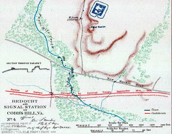 In September 1864 President Lincoln trailed his anti-slave liberation candidate in his bid for re-election. On August 23, 1864 Lincoln wrote “ It seems probable that this administration will not be re-elected. Then it will be my duty to so co-operate with the President elect, as to save the Union between the election and the inauguration; as he will have secured his election on such ground that he can not possibly save it afterwards.” Martin Graham and George Skoch, Great Battles of the Civil War Lincoln confided in Butler to the point that he asked Butler to join him on the 1864 presidential ticket as vice president. Butler declined the invitation stating that he wanted to stay on the battlefield. Butler mustered the first Black regiment into service for the Union Army and played a key roll in establishing the United States Colored Troops. Like John Brown, Butler felt that he was doing God's work. Butler said: "God Almighty himself is doing it. No man's hand can stay it. It is no other than the omnipotent God who has taken this mode of destroying slavery. We are but the instruments in his hands. We could not prevent it if we would. And let us strive as we might, the judicial blindness of the rebels would do the work of God without our aid, and in spite of all our endeavors against it." Because of his liberal leanings, Butler was criticized by his conservative colleagues and his colored troops were not respected. Butler needed a great victory that would earn respect for his colored troops and himself as well. Union victories at New Market Heights and Atlanta were enough for Lincoln to pass his opponent and win the election. Since the summer of 1864 the Union Army was south of Richmond and unable to control the territory north of the James River. Butler’s headquarters was located at Deep Bottom which was on the north shore of the James River. Butler developed a plan in which Black troops would attack New Market Heights which was a heavily fortified redoubt on the left flank of the Confederate line protecting Richmond. At the same time the plan called for White troops to attack the middle of the Confederate line at Fort Harris. Richmond was protected by 3000 entrenched Confederate troops and most of these were positioned close to New Market Heights and in front of Butler at Deep Bottom. The target for the Black troops had failed to be taken by White troops twice. Success by Black troops would prove the value of Black troops once and for all. He told his Black men to “take New Market Heights at any cost”. New Market Heights was heavily fortified, in fact Cadets from a near by military school successfully defeated a Union attack there earlier that year. General Butler discussed is attack on Richmond with General Grant and he also described his dual objective. " I further told him that I had another thing in view. The affair of the mine at Petersburg, which had been discussed between us, had convinced me that in the Army of the Potomac negro troops were thought of no value, and with the exception of an attack under Smith on the 15th of June, where they were prevented from entering Petersburg by the sloth, inaction, or I believe worse, of Smith, the negro troops had had no chance to show their valor or staying qualities in action. I told him that I meant to take a large part of my negro force, and under my personal command make an attack upon Newmarket Heights, the redoubt to the extreme left of the enemy's line. If I could take that and turn it, then I was certain that I could gain the first line of the enemy's entrenchment’s around Richmond. I said:" I want to convince myself whether, when under my own eye, the negro troops will fight; and if I can take with the negroes, a redoubt that turned Hancock's corps on a former occasion, that will settle the question." I proposed to try this in a manner that I had not before seen attempted, either in the Army of the Potomac or else where, - that is, by a regular "dash" such as I had read of in the history of the wars of Europe. " My white regiments were always nervous when standing in line flanked by colored troops, lest the colored regiments should give way and they (the white) be flanked. This fear was a deep-seated one and spread far and wide, and the negro had had no sufficient opportunity to demonstrate his valor and his staying qualities as a soldier. And the further cry was that the negroes never struck a good blow for their own freedom. Therefore, I determined to put them in position, to demonstrate the fact of the value of the negro as a soldier, coute qui coute, and that the experiment should be one of which no man should doubt, if it attained success. Hence the attack by the negro column. on Newmarket Heights." Black troops had demonstrated in places like Fort Hudson, Millikens Bend and Fort Wagner that they were effective at charging Confederate works. Their charges were often described as determined and tenacious. Butler’s plan called for them to not stop and fire their muskets during their charge but continue until they entered the Confederate works. This tactic would utilize their strength of charging works. The Joint Committees warned General Grant after the "affair at the mine" to utilize Black troops when the situation called for their talents. General Grant approved Butler’s plan. “At half past four o'clock I found the colored division, rising three thousand men, occupying a plain which shelved towards the river, so that they mere not observed by the enemy at Newmarket Heights. They were formed in close column of division right in front. I rode through the division, addressed a few words of encouragement and confidence to the troops. I told them that this was an attack where I expected them to go over and take a work which would be before them after they got over the hill, and that they must take it at all hazards, and that when they went over the parapet into it their war cry should be, " remember Fort Pillow."